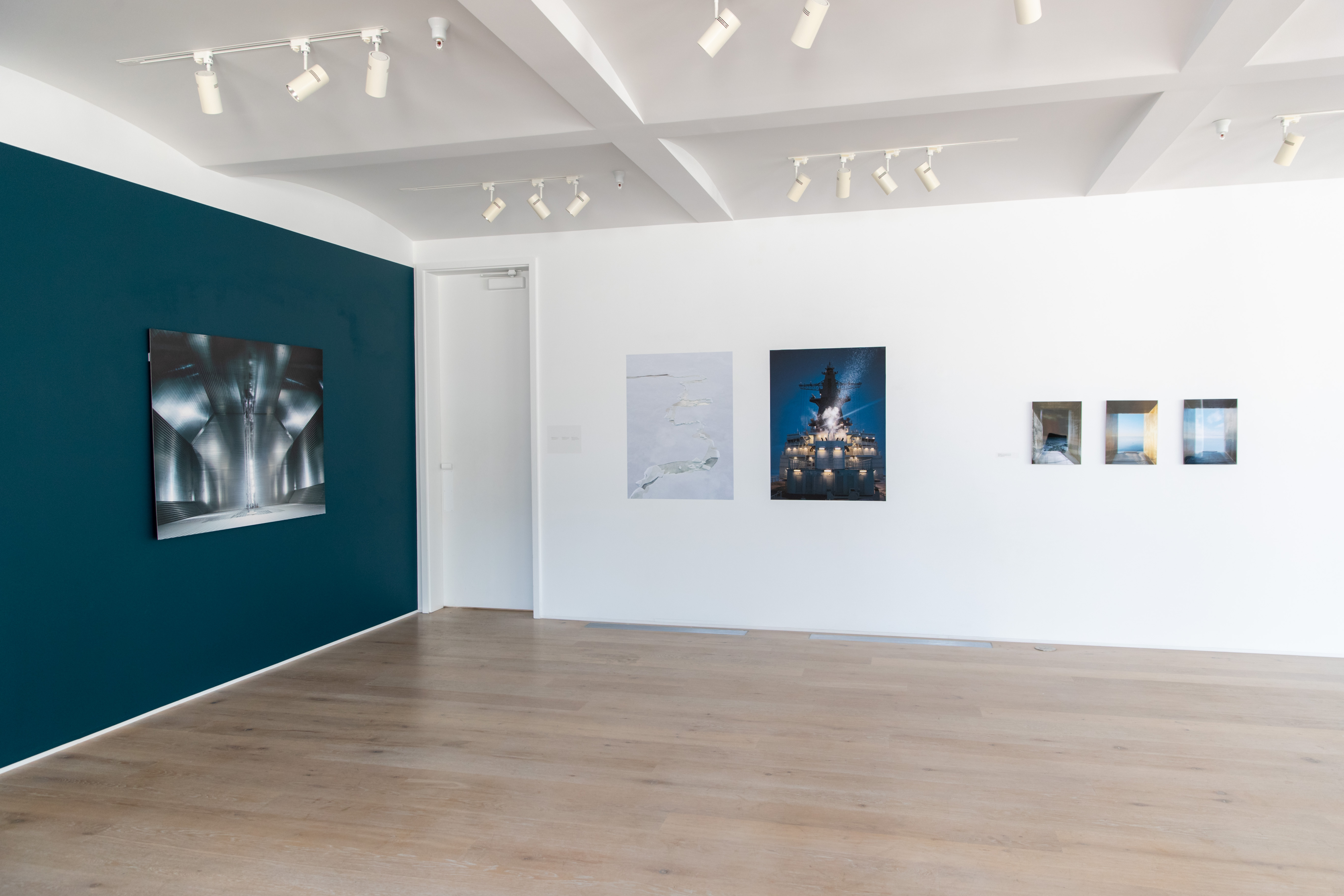 Other elements of the exhibition are meant to echo time on the ice, and the vast and ever present sea. A single vantage from a ship is shown three times. The view becomes a window to the constant horizon, whose only change is marked by shifts in light. These prints were housed in diasec, a kind of acrylic sandwich, forming a glassy case like a thick slab of ice.