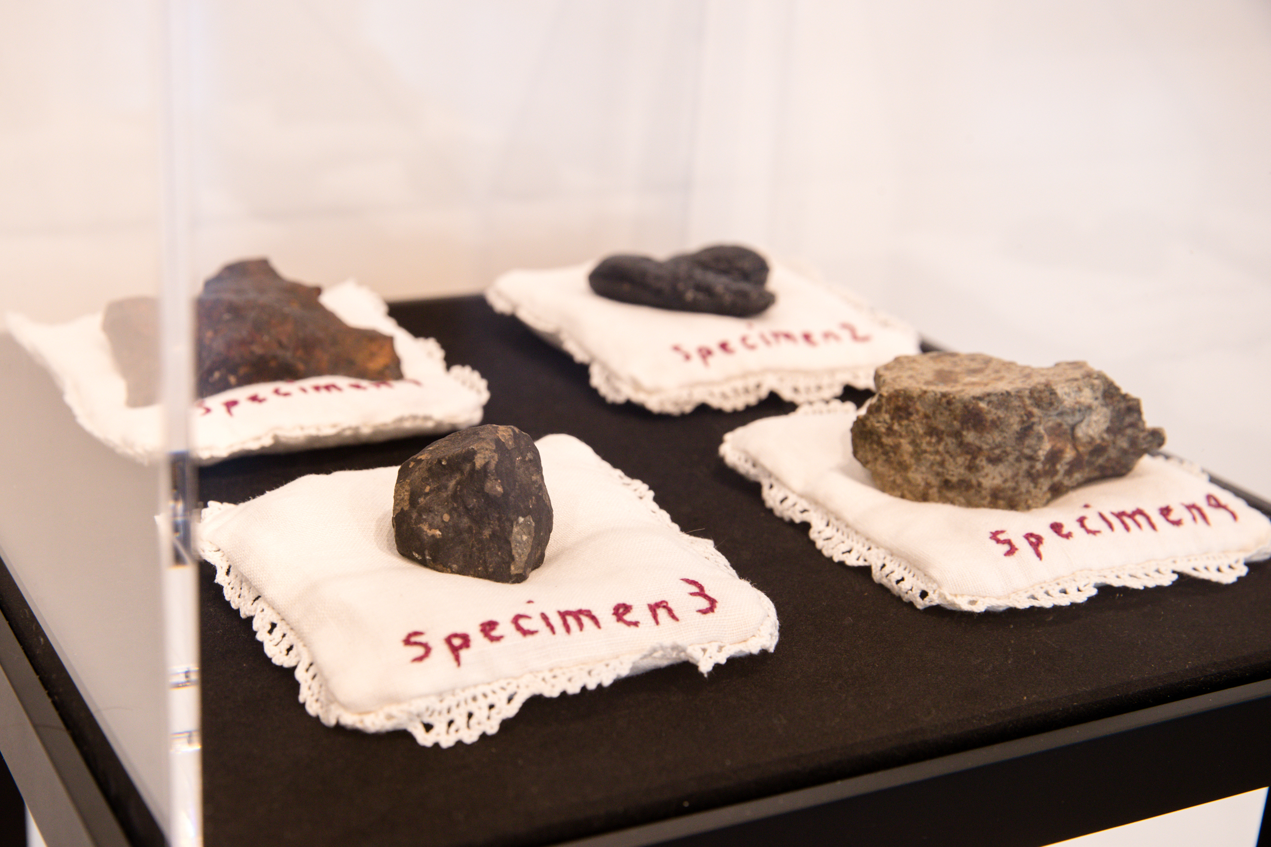 Early accounts of meteorites were dismissed as superstition, as if believing in the rocks was like believing in magic. But why shouldn’t they be magic? Even if and when completely explained, are they not still a bit miraculous? In this work, there is a playful yet intentional comingling of truth and tales, with a reminder that not all tales are untrue. There is tenderness in Martin’s approach that comes from the act of careful listening- she is listening to the old tales told in small towns, she is listening to scientists, she even listens to the rocks themselves.