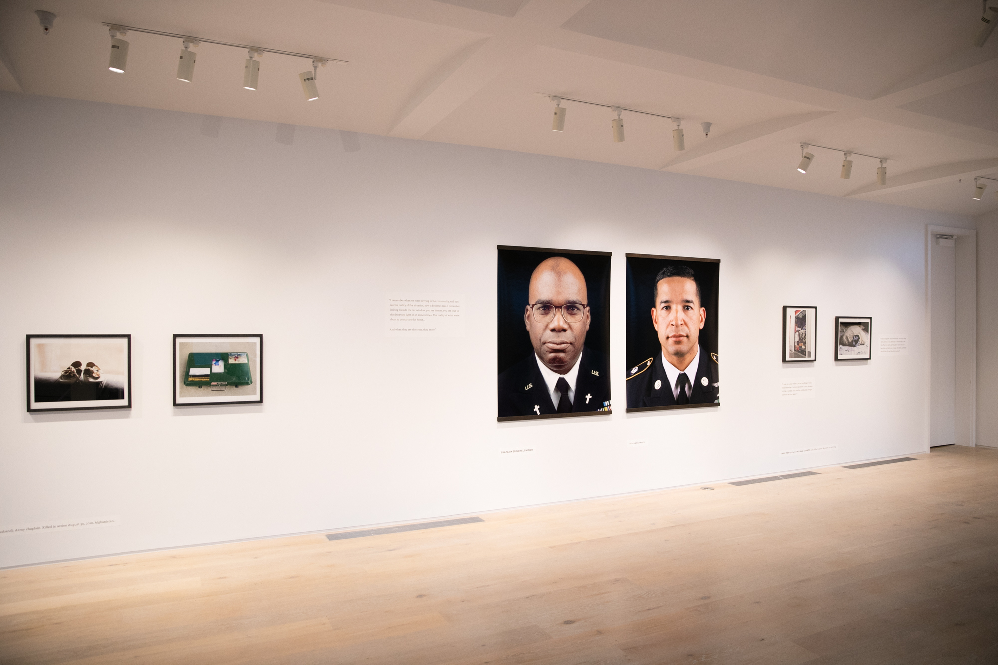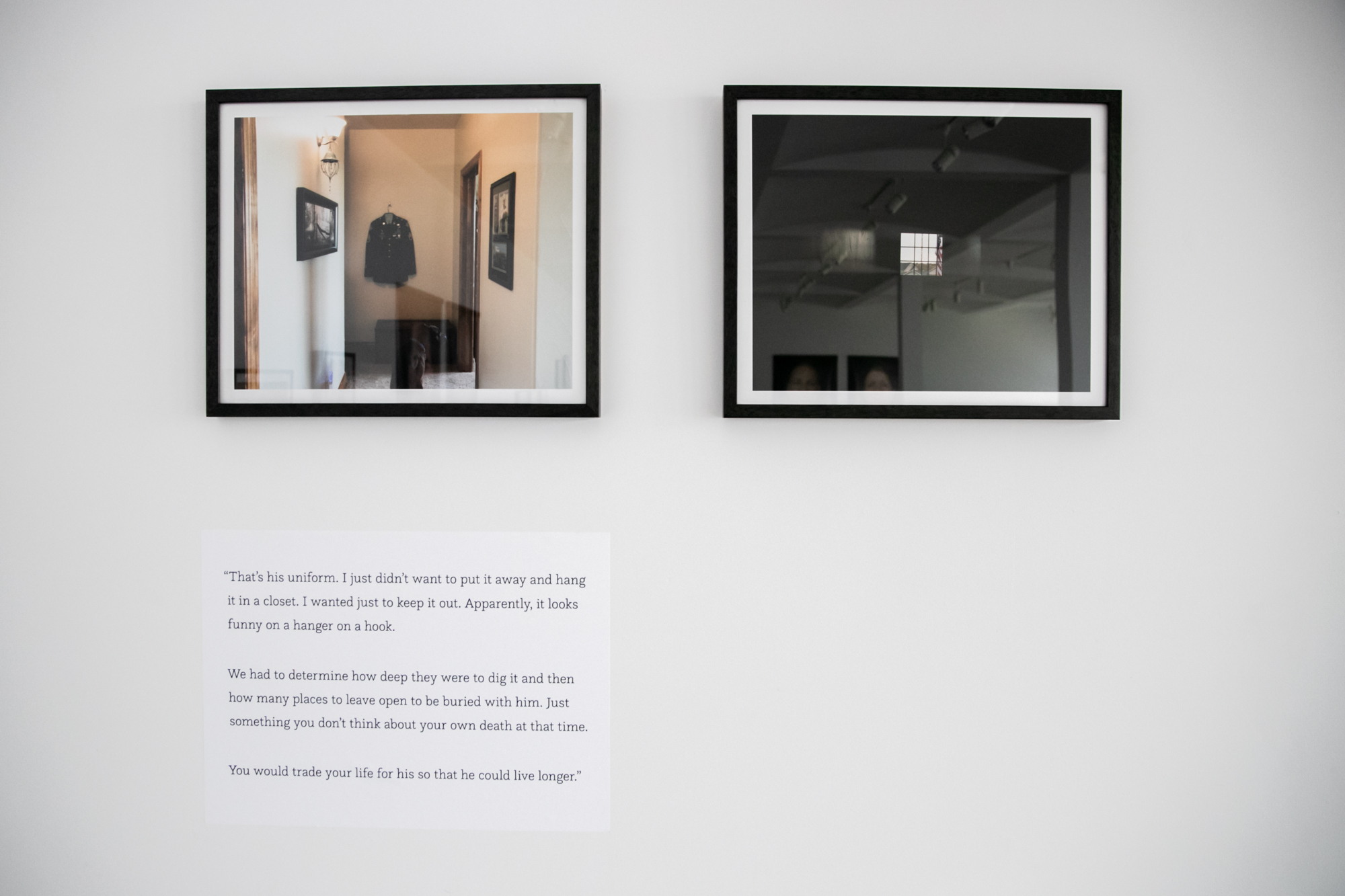 There is a knock on the door that military families hope to never receive. Notifiers arrive in pairs; one chaplain and one officer are tasked with bearing the most difficult news. Abergil has included their perspective, with large unflinching portraits that are interspersed between the family stories. Their bodies are poised in formal dress uniforms, but sorrow reflects back from their eyes. The images ask us to confront the faces that no parent wants to see. In the gallery, these portraits are larger than life size, as inescapable as the news they bear.